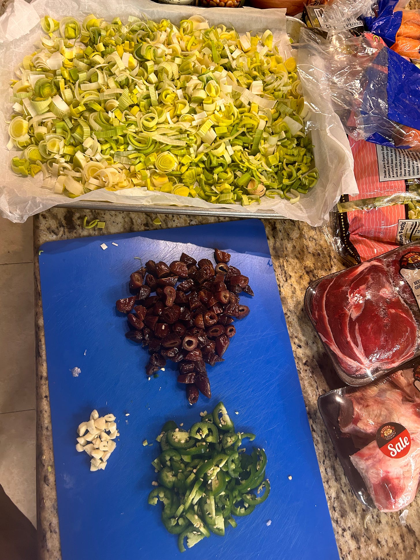 Here are the ingredients: Leeks, jalapeños, garlic, dates, olive oil, and salt