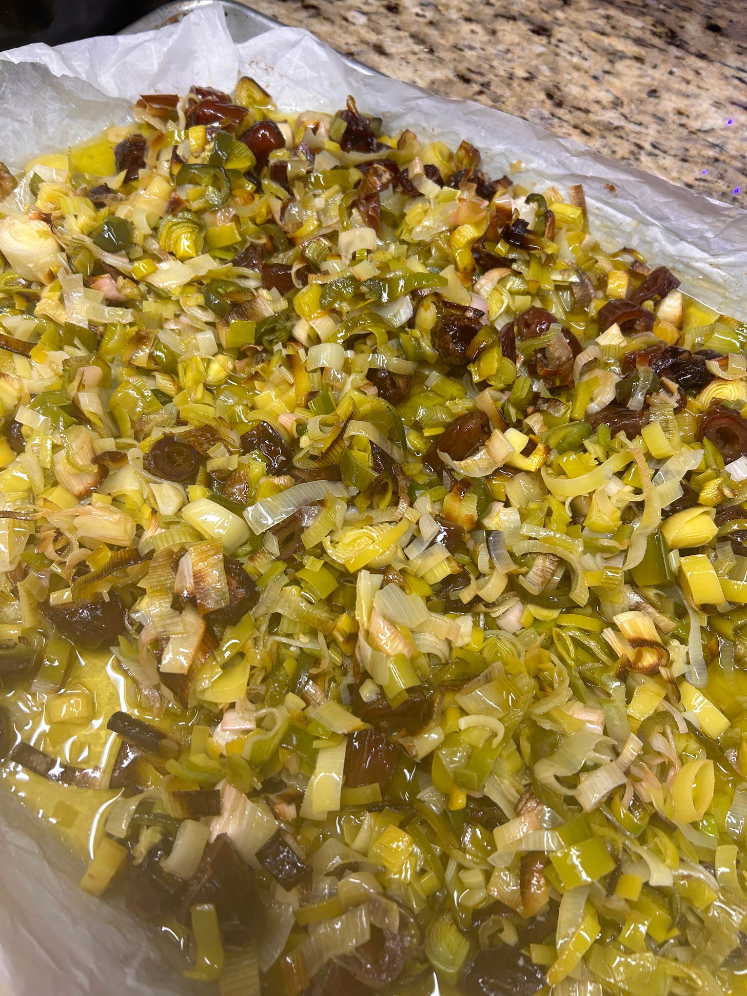 Chop up leeks, dates, garlic, and jalapeños. Then pour olive oil all over it and sprinkle enough salt to make it tasty. Then bake it for 35 minutes in a 350 degree oven. I don’t know amounts, just play around with it until it tastes good. I know, I’m the next Martha Stewart.